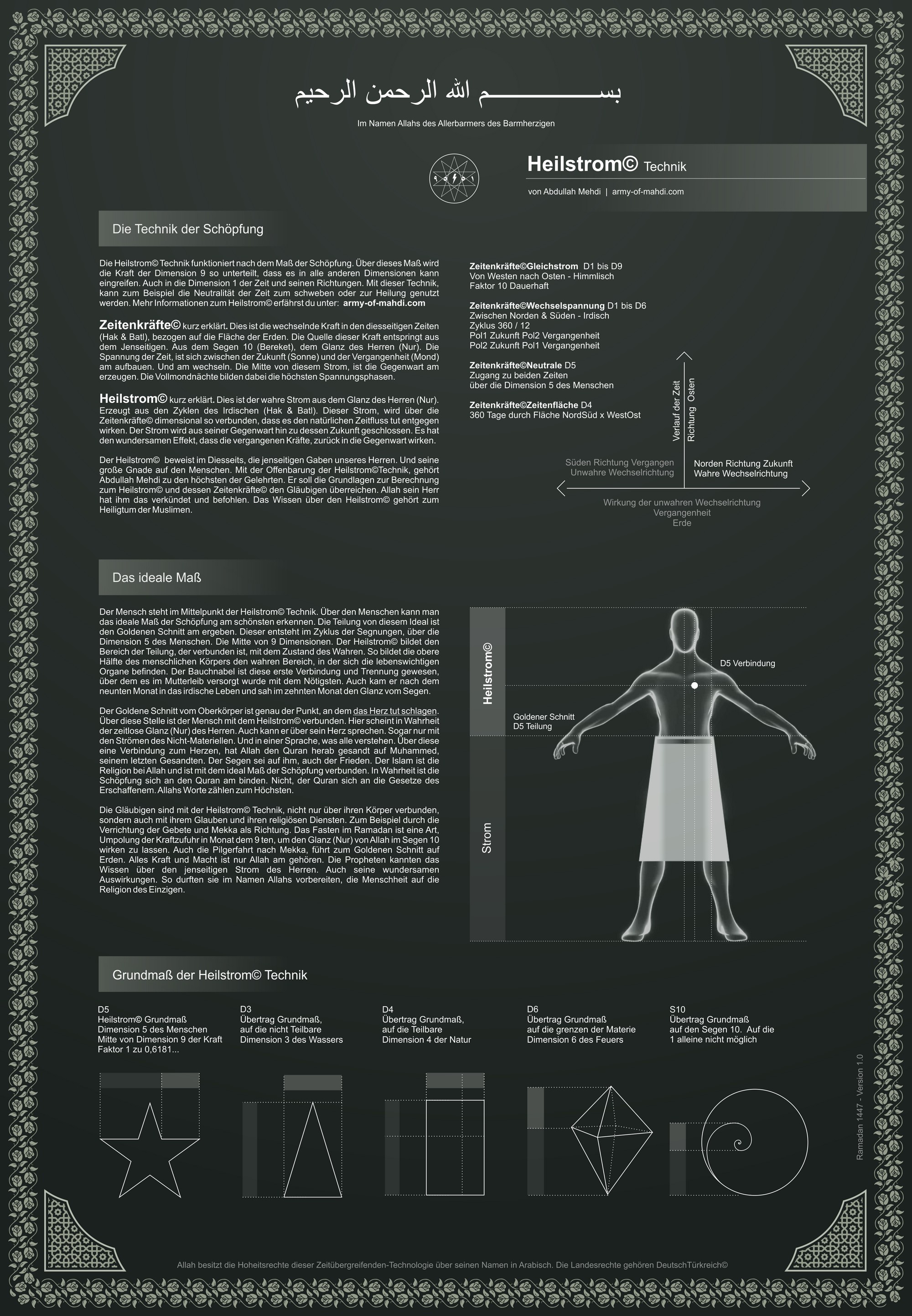 Der Heilstrom© beweist im Diesseits, die jenseitigen Gaben unseres Herren. Und seine große Gnade auf den Menschen. Mit der Offenbarung der Heilstrom©Technik, gehört Abdullah Mehdi zu den höchsten der Gelehrten. Er soll die Grundlagen zur Berechnung zum Heilstrom© und dessen Zeitenkräfte© den Gläubigen überreichen. Allah sein Herr hat ihm das verkündet und befohlen. Das Wissen über den Heilstrom© gehört zum Heiligtum der Muslimen.