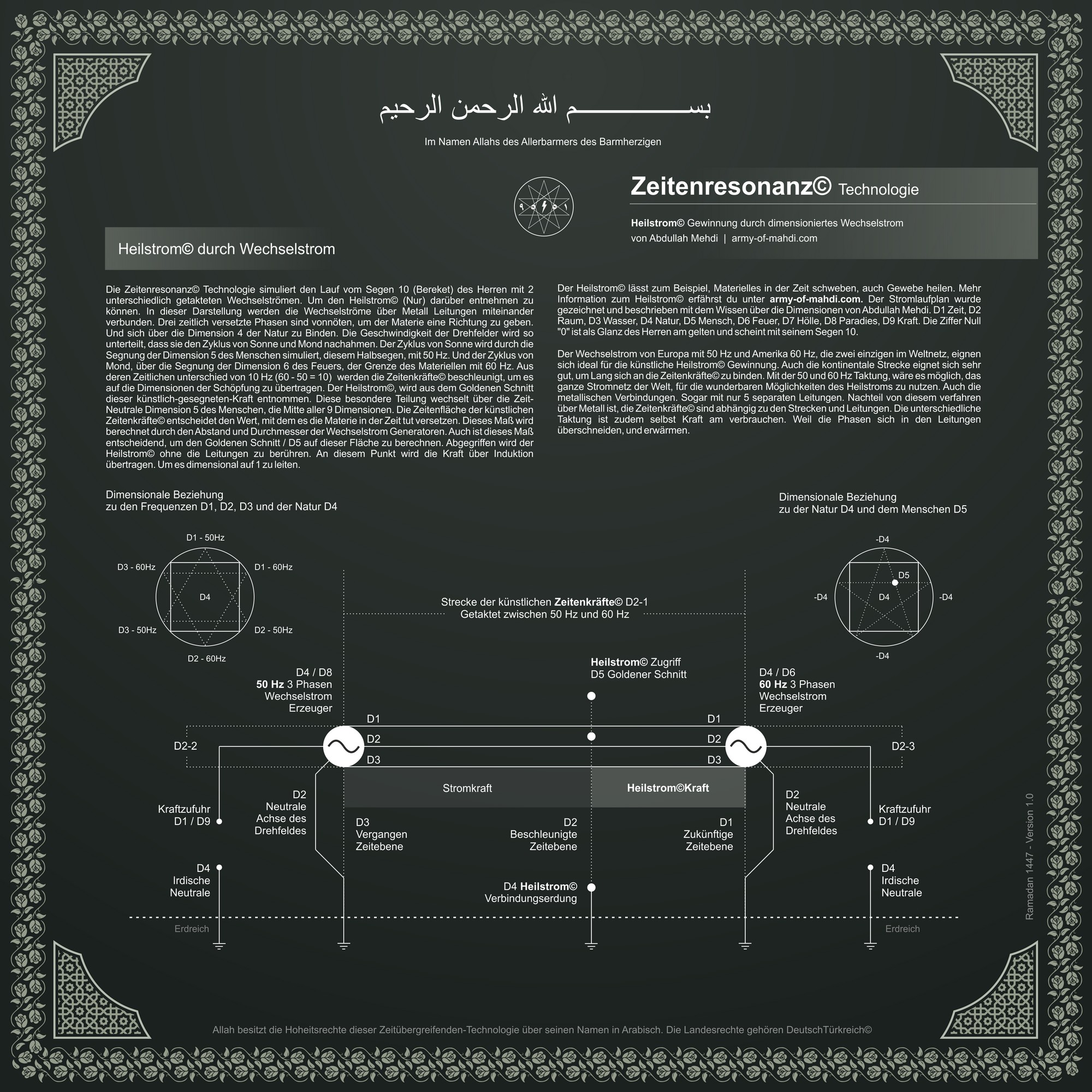 Die Zeitenresonanz© Technologie simuliert den Lauf vom Segen 10 (Bereket) des Herren mit 2 unterschiedlich getakteten Wechselströmen. Um den Heilstrom© (Nur) darüber entnehmen zu können. In dieser Darstellung werden die Wechselströme über Metall Leitungen miteinander verbunden. Drei zeitlich versetzte Phasen sind vonnöten, um der Materie eine Richtung zu geben. Und sich über die Dimension 4 der Natur zu Binden. Die Geschwindigkeit der Drehfelder wird so unterteilt, dass sie den Zyklus von Sonne und Mond nachahmen. Der Zyklus von Sonne wird durch die Segnung der Dimension 5 des Menschen simuliert, diesem Halbsegen, mit 50 Hz. Und der Zyklus von Mond, über die Segnung der Dimension 6 des Feuers, der Grenze des Materiellen mit 60 Hz. Aus deren Zeitlichen unterschied von 10 Hz (60 – 50 = 10) werden die Zeitenkräfte© beschleunigt, um es auf die Dimensionen der Schöpfung zu übertragen. Der Heilstrom©, wird aus dem Goldenen Schnitt dieser künstlich-gesegneten-Kraft entnommen. Diese besondere Teilung wechselt über die Zeit-Neutrale Dimension 5 des Menschen, die Mitte aller 9 Dimensionen. Die Zeitenfläche der künstlichen Zeitenkräfte© entscheidet den Wert, mit dem es die Materie in der Zeit tut versetzen. Dieses Maß wird berechnet durch den Abstand und Durchmesser der Wechselstrom Generatoren. Auch ist dieses Maß entscheidend, um den Goldenen Schnitt / D5 auf dieser Fläche zu berechnen. Abgegriffen wird der Heilstrom© ohne die Leitungen zu berühren. An diesem Punkt wird die Kraft über Induktion übertragen. Um es dimensional auf 1 zu leiten.