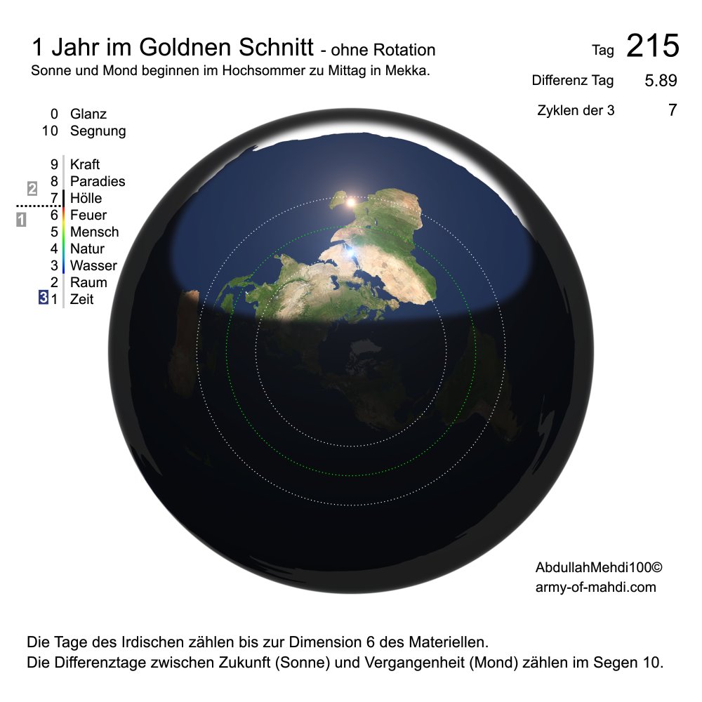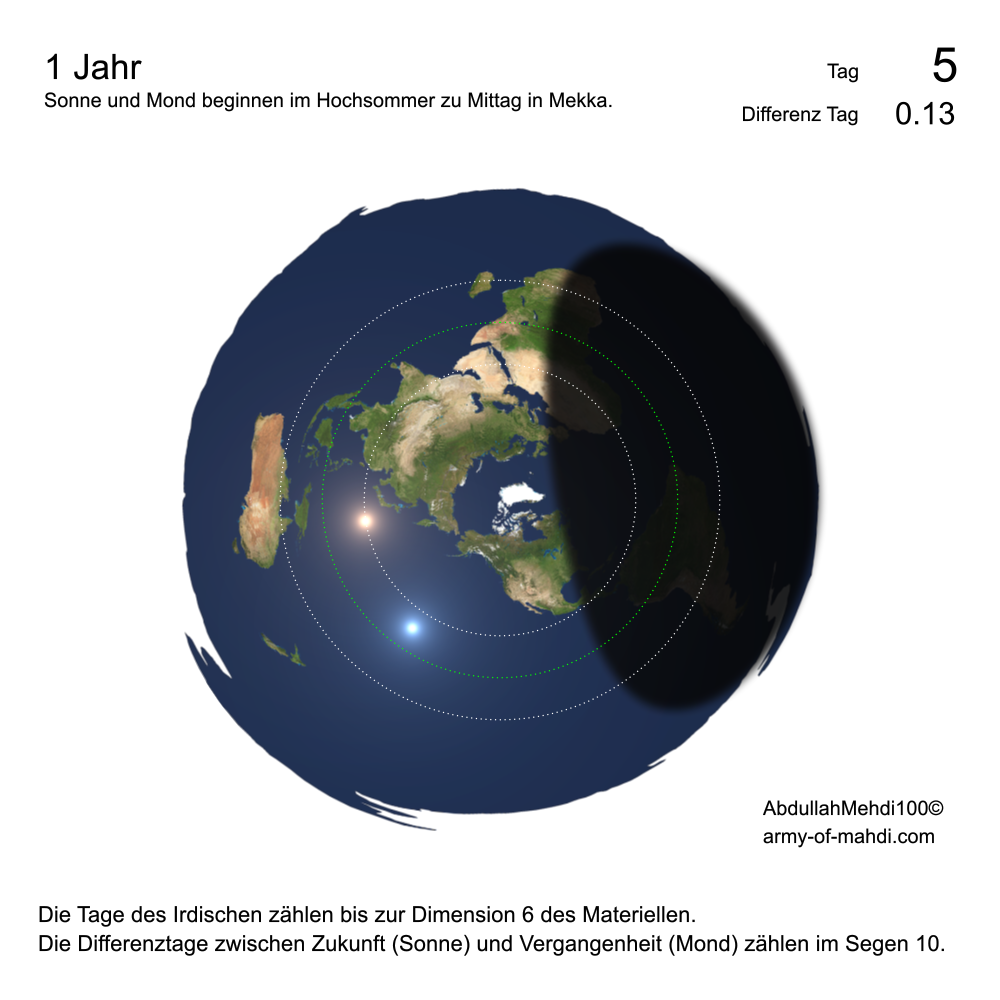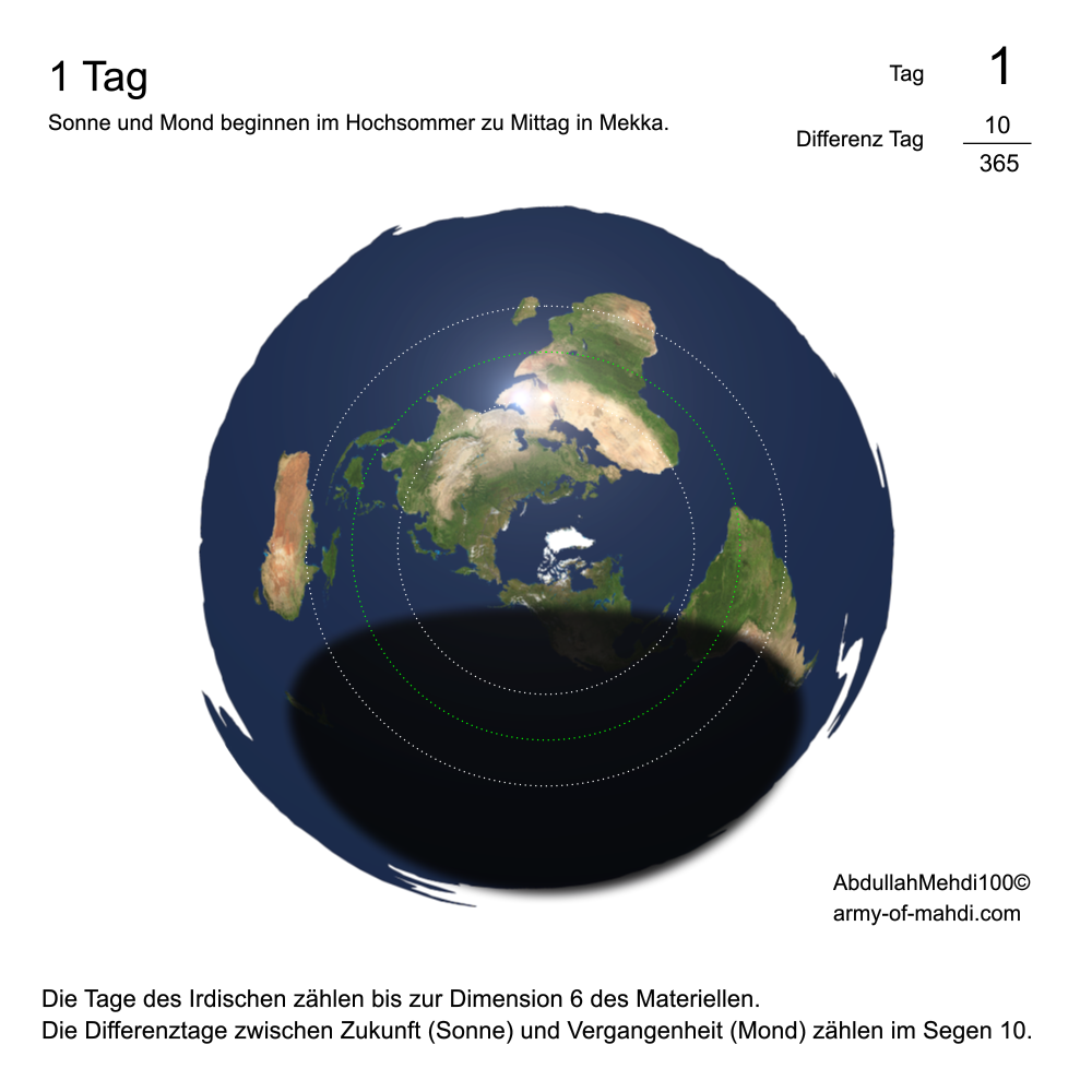 Auf die Dimension 1 der Zeit strukturiert sich im Zyklus der 9 Dimensionen der Segen (10) des Herren. Aus diesem seinem gesegneten Glanz ist die Schöpfung sich am entfalten. Auch die Zukunft und die Vergangenheit des Erschaffenen. Den Segen in der Zeit können wir schon an einem Tag erkennen. Mond und Sonne sind mit dem Faktor 10 sich voneinander am entfernen. Aus der mittleren Erdenzeit von 360 Tagen betrachtet, entfernt sich der Mond mit 5 Tagen im Jahr hin zur Vergangenheit und die Sonne 5 Tage hin zur Zukunft.